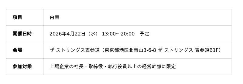 参加者は、上場企業の社長・取締役・執行役員のみ。通常では接点を持ちにくい意思決定者と、自然な形で対話できる貴重な機会をご提供します。