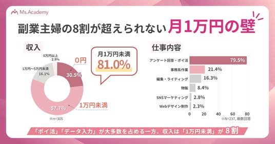 女性向けキャリアスクール「Ms.Academy(ミスアカデミー)」は、オンライン(在宅)での副業に興味がある女性305名を対象に、「主婦の副業の始め方に関する実態調査」を実施しました。
