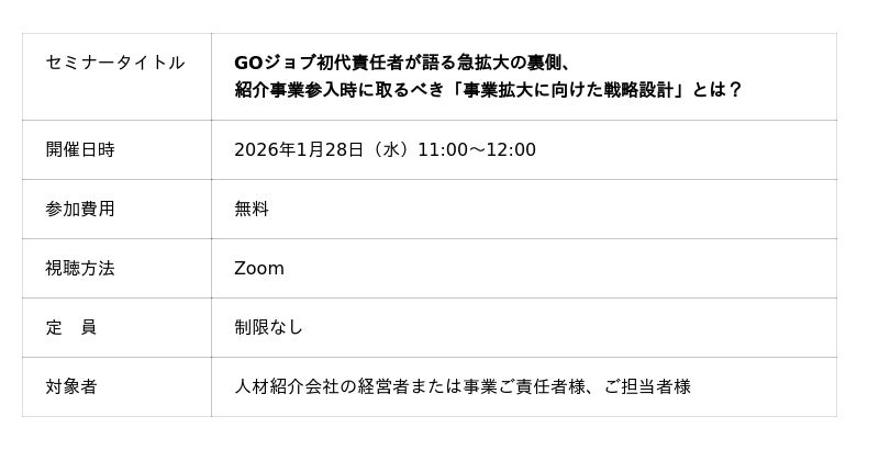そこで今回は「GOジョブ」初代責任者の杉本氏が、異業種から参入した同事業が直面した「壁」と、事業を急成長させるために具体的にどのような戦略をとったのか? 本業とのシナジーの生み出し方から設計すべきKPIまで紹介事業立ち上げの裏側を詳細に語っていただきます。