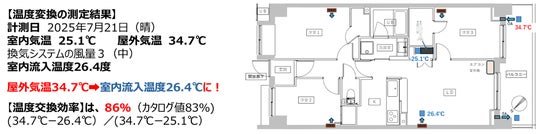 夏の外気が34.7℃であるのに屋内に入る新鮮空気の温度は26.4℃と快適な空気質環境となります。