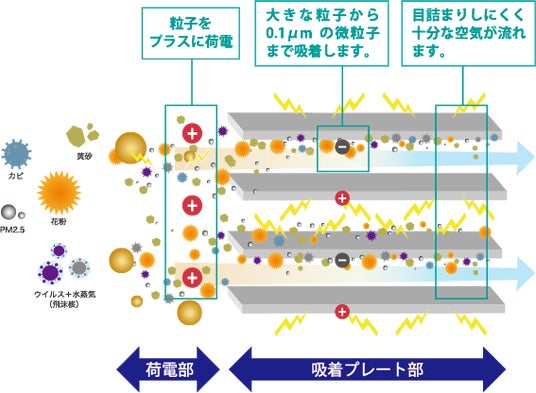花粉・ウイルス・PM2.5など、汚染物質を電子式集塵フィルタにより0.1㎛以下の微粒子までも除去。