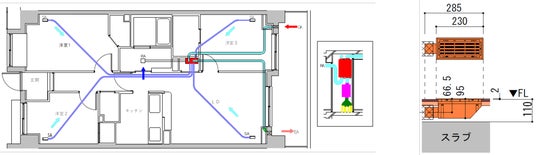【設置例1.】 マンションの二重床(置床空間)をダクト空間として利用住まい全体に快適な熱交換型の計画換気が可能となります。大部分のダクトが二重床の床下空間に配管されますので、すっきりとしたデザインが可能となります。