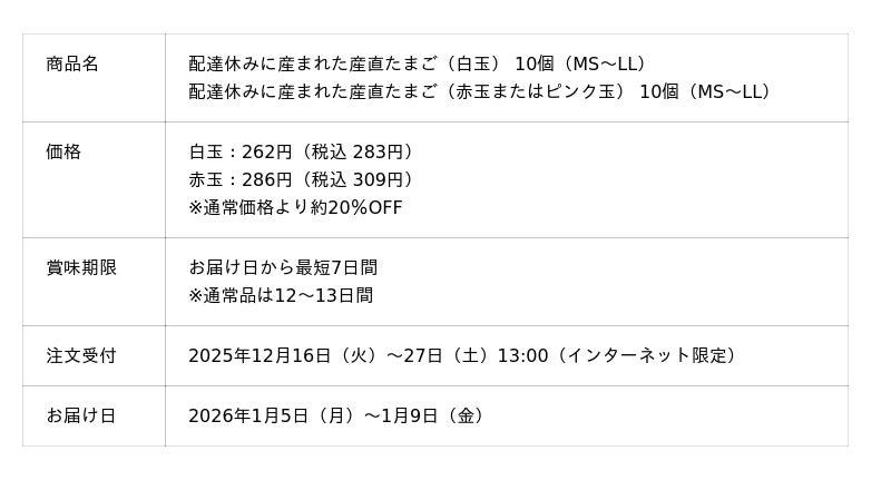 「配達休みに産まれた産直たまご」は、年末年始の宅配休業期間に採卵するため、配達時点の賞味期限は、お届け日を含む最短7日で既存品の賞味期限より短くなります 。飼育環境や飼料内容などの品質は、既存品の「産直たまご」と変わりません。通常価格から約20%引きとし、年始の食卓と産地を応援します。