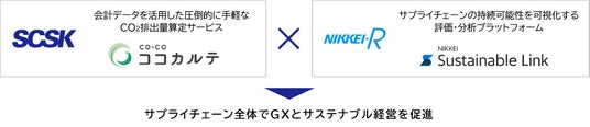 SCSKが提供するCO2排出量自動算定ソリューション「CO×CO カルテ(ココカルテ)」と、日経リサーチが展開するサステナブル経営評価プラットフォーム「日経サステナブルリンク」をサービス提携し、両サービスのデータに基づいたサプライチェーンの可視化と改善支援を統合的にサポートします。