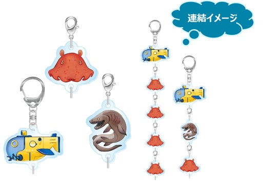 深海生物採集キーホルダー(潜水船) 【440円】 / 深海生物採集連結チャーム(ラブカ・メンダコ) 【各330円】潜水船のキーホルダーに、深海生物のチャームを連結して自分だけのオリジナルキーホルダーを作ることができます。