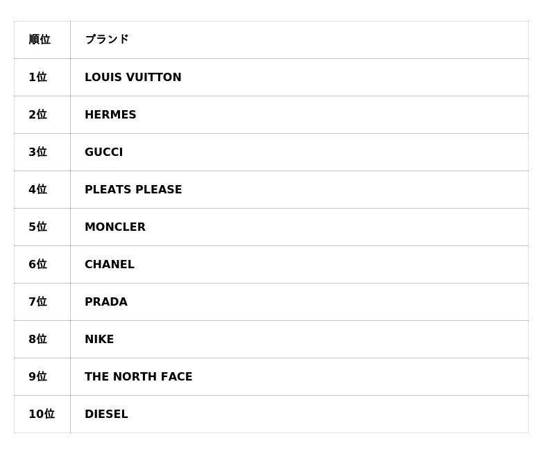 「LOUIS VUITTON」「HERMES」「GUCCI」「CHANEL」などがTOP10入り