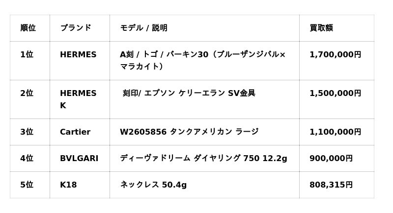 特に「HERMES」は査定額トップ2を占め、銀座の高級市場における揺るぎない存在感を証明する結果となりました。