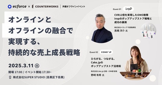ポップアップストアの出店支援プラットフォーム「SHOPCOUNTER(ショップカウンター)」を運営する株式会社COUNTERWORKS(本社:東京都目黒区、代表取締役CEO:三瓶 直樹、以下カウンターワークス)は、統合コマースプラットフォーム「ecforce」を提供する株式会社SUPER STUDIO(所在地:東京都目黒区、代表取締役CEO:林 紘祐)と共同で、ポップアップストア出店を検討するD2CやECサイトの担当者を対象に、「オンラインとオフラインの融合で実現する、持続的な売上成長戦略」と題した無料のリアルセミナーを2025年3月11日(火)に開催いたします。