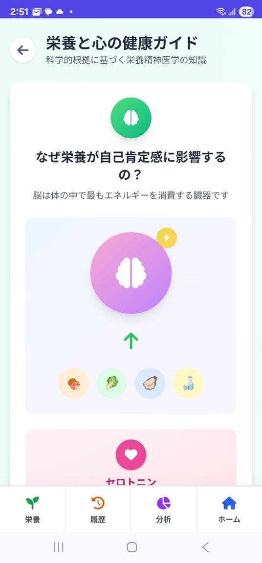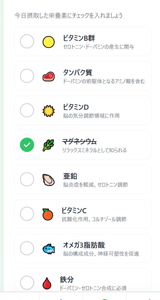 最新の栄養精神医学研究によると、食事とメンタルヘルスは密接に関連しています。セロトニン(幸福感)やドーパミン(やる気)などの神経伝達物質の産生には、特定の栄養素が必要です。My Compassの「栄養と心の健康」機能では: