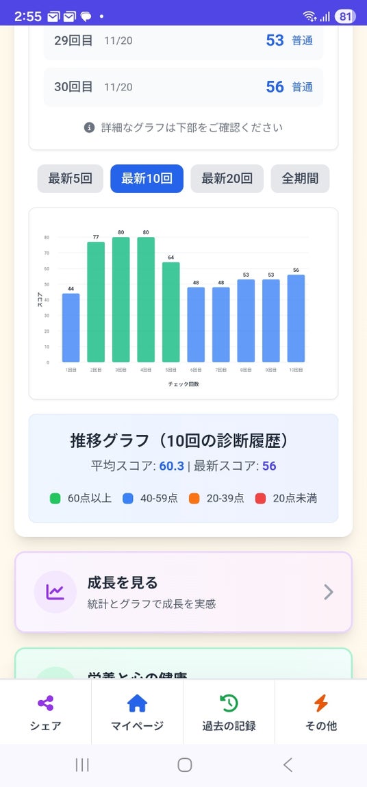 20問の診断で自己肯定感スコアを測定。定期的にチェックすることで、スコアの推移をグラフで確認できます。「本当に効果があるのか?」という不安に対して、客観的なデータで成長を実感できる設計です。