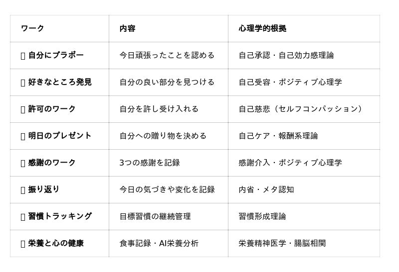 自己肯定感向上のために、エビデンスに基づいた8つのワークを毎日実践できます。