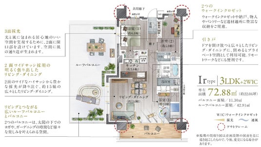 間取りは、全ての住戸を南東・南西向きの3LDKとし、全居室に開口を設けた角住戸プランや、42平方メートル 超のルーフバルコニー付き角住戸プラン、専用庭付きプランなど、60m2台~80m2台の多彩なプランをご用意しました。