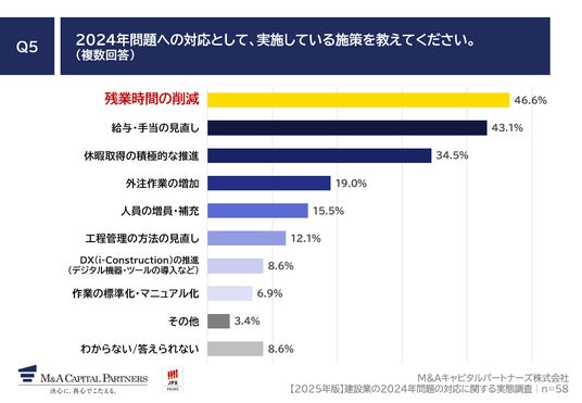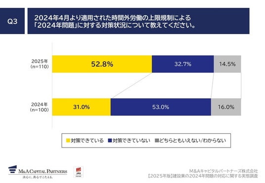 M&Aキャピタルパートナーズ株式会社(東京都中央区・代表取締役社長 中村悟)は、建設業の経営者110名を対象に、【2025年版】建設業の2024年問題の対応に関する実態調査を実施しましたので、お知らせいたします。