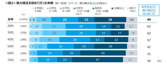 視力矯正をしている人に、初めて視力矯正を行った年齢を確認した。全体では「中学生」と「19歳以上」がボリュームゾーン。若い年代ほど視力矯正を行った年齢が早まる傾向が顕著であった。特に20~30代は、小学生までに3割以上、中学生までは6割以上が視力矯正を行っていた。<図2>