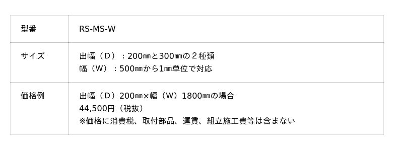 今回、「アールエスバイザー(R)」の木造後付けシリーズに、新たにシンプルでシャープな意匠が特長の小ひさしタイプ「RS-MS-W型」「RS-M-W型」がラインアップされました。「RS-MS-W型」は、ブラケット(取付け金具)にひさしを取り付けるブラケット式。出幅は200mmと300mm、横幅は500mmから1mm単位で対応。「RS-M-W型」は直付けタイプで、出幅は100mmと180mm、横幅は500mmから1mm単位で対応。カラーはシルバー、ステンカラーの2種類から選択。耐積雪高は60cm(1800N/平方メートル )まで。木造建築物の窓や勝手口などの上部への設置に最適です。