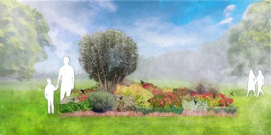 この展示では、花粉媒介者(ポリネーター)とシソ科植物(SalviaやMonardaなど)の進化的な関係 に焦点を当て、ハチドリが好む赤やオレンジの蜜源植物を植栽した庭園 を再現します。矢口太郎がデザインした等身大の折り紙ハチドリ は、それぞれ異なる翼のポーズを持ち、花の間を飛び交うハチドリの姿をリアルに表現 します。また、庭園の楕円形と曲線のデザイン は、ハチドリの優雅な飛行パターンをモチーフにしています。