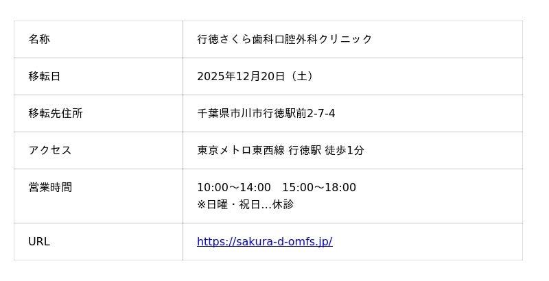 さくら歯科口腔外科クリニックは、2025年12月20日(土)に千葉県市川市行徳駅前2-7-4への移転を行います。新店舗では、2025年12月20日10:00から内覧会を開催、15:00から診療を開始し、患者さまへの診療サービス提供を継続いたします。