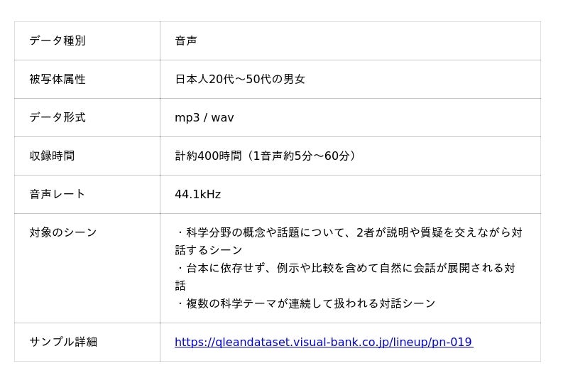 Visual Bank株式会社(東京都港区、代表取締役CEO 永井真之、以下「Visual Bank」)は、傘下の株式会社アマナイメージズを通じて展開するAI学習用データソリューション『Qlean Dataset(キュリンデータセット)』において、『日本語・2話者・科学テーマトーク音声コーパスデータセット』の提供を開始しました。