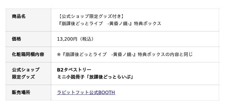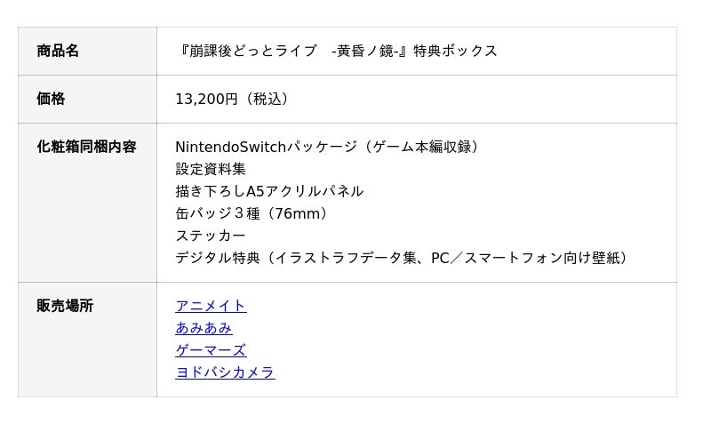 『崩課後どっとライブ -黄昏ノ鏡-』特典ボックス(税込み13,200円)は、アニメイト、あみあみ、ゲーマーズ、ヨドバシカメラにて予約を受け付けます。詳細は各販売店の公式サイトをご確認ください。