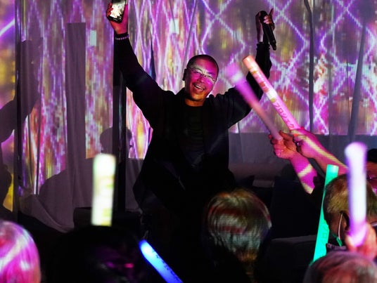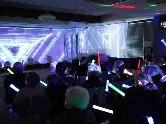 光で彩られた非日常空間に、昭和から令和のヒット曲が流され、スクリーンには昔の街並みや、若い頃の自分たちの姿が投影されることで当時を思い出しながら一緒に歌ったり、音楽に合わせてペンライトを振ったり、体を動かすなど楽しみながら健康増進を図るイベントです。