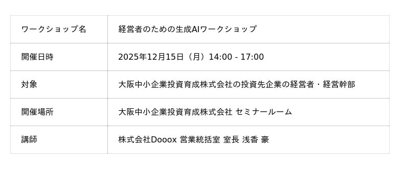 『緊急ではないけれど、重要な課題』について、企業経営者に伴走する特命社長室(R)︎を展開する株式会社Dooox(本社:東京都品川区、代表:久保寺亮介/以下「当社」)は、2025年12月15日(月)、大阪中小企業投資育成株式会社(本社:大阪市北区、代表:小林 利典)主催のもと、同社の投資先企業の経営者・経営幹部様を対象とした「経営者のための生成AIワークショップ」を開催いたしました。当日は、当社営業統括室 室長の浅香 豪が講師を務め、生成AIに関心のある30名以上の経営者様にご参加いただきました。