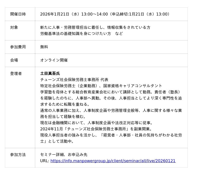 総合人材サービスのマンパワーグループ株式会社(本社・東京都港区、代表取締役社長:池田 匡弥、以下マンパワーグループ)は、2026年1月21日(水)13:00~14:00に、企業の人事・労務管理担当者を対象とした無料オンラインセミナー「1時間で学ぶ労働基準法の基本」を開催します。本セミナーでは、人事・労務管理に必要な法律の基礎知識をはじめ、36協定や就業規則など労働基準法を実務運用するためのポイントを解説します。