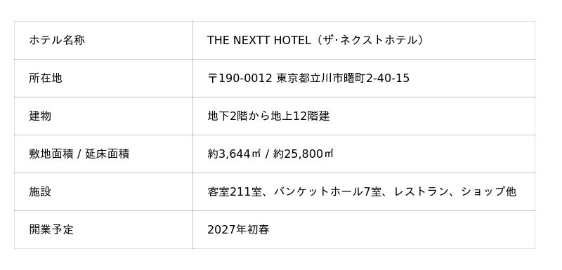 株式会社立飛ホスピタリティマネジメント(本社:東京都立川市、代表取締役:村山正道)は、「THE NEXTT HOTEL(ザ・ネクストホテル)」を2027年初春、東京都立川市のファーレ立川に開業いたします。