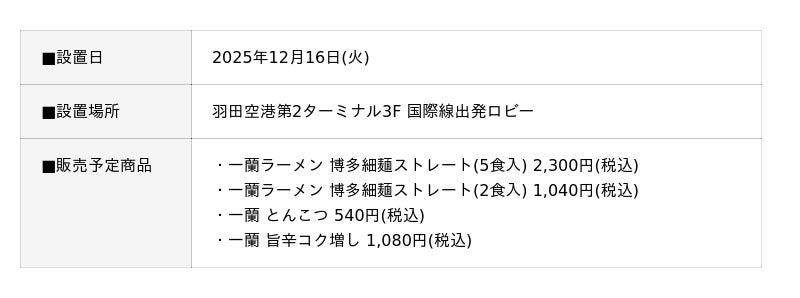 株式会社一蘭は、2025年12月16日(火)、羽田空港第2ターミナル(第2ビル)3F・国際線出発ロビーに、おみやげ商品専用の自動販売機を新たに設置いたします。
