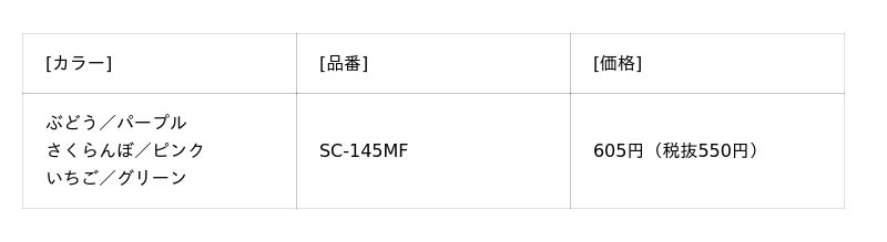 今回発売するのは、2014年の登場以来、ご好評を得ている子ども用はさみ「フィットカットカーブ ジュニア」の限定デザイン。切れ味や安全性などの優れた性能はそのまま、刃にかわいらしいくだもののモチーフを施し、ハンドルやカシメ部分には、淡く優しいカラーを採用しました。本体カラーは、ぶどう/パープル、さくらんぼ/ピンク、いちご/グリーンの3種類、メーカー希望小売価格(税込)は605円です。
