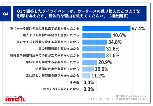 ライフイベントがカーリース選択に与えた影響として、「家計の負担を見直す必要があったから」が67.4%と最も高く、「車は必要だが、ずっと所有し続ける前提ではなく、ライフイベントに合わせて柔軟に付き合いたい」という生活者の意識変化がうかがえます。