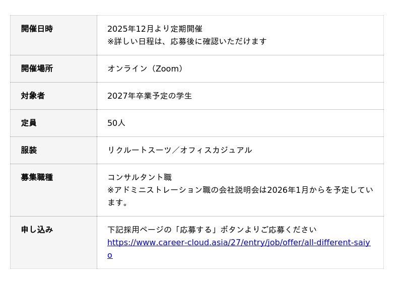 27卒学生向け採用説明会 申込受付開始・ALL DIFFERENT株式会社