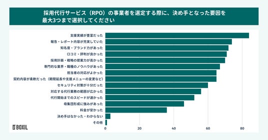RPO事業者を選定する際の決め手を複数回答可(最大3つまで選択可)で聞いたところ、「支援実績が豊富だった」が最も多く、次いで「報告・レポート内容が充実していた」「知名度・ブランド力があった」と続きました。