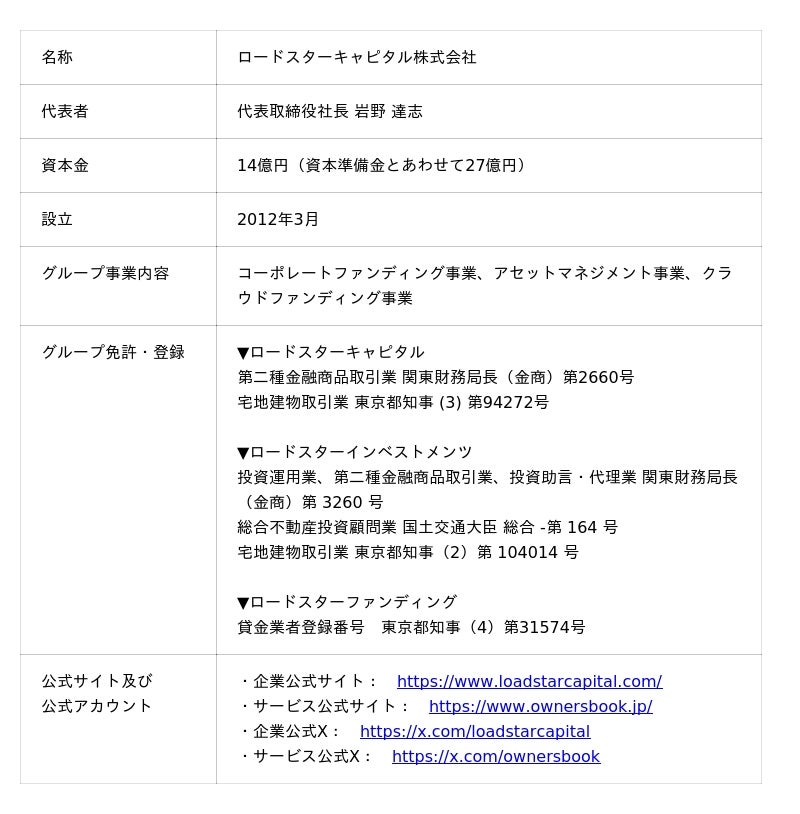 『OwnersBook』エクイティ型案件の運用開始に関するお知らせ【ロードスターグループ】