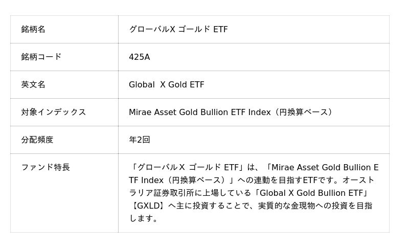 当ETFは、「Mirae Asset Gold Bullion ETF Index(円換算ベース)」への連動を目指すETFです。オーストラリア証券取引所に上場している「Global X Gold Bullion ETF」【GXLD】へ主に投資することで、実質的な金現物への投資を目指します。また当ETFの信託報酬は東証上場の金ETFの中で最低水準*です。