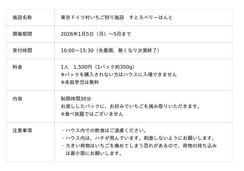 東京ドイツ村(所在地:千葉県袖ケ浦市・運営:明和興産株式会社)では、カントリーエリアにいちご狩り施設「すとろべりーはんと」を2026年1月5日(月)に新規オープンいたします。