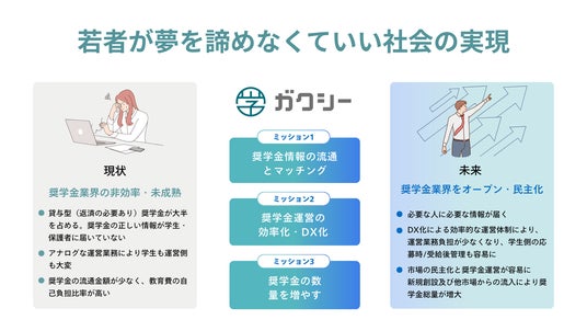株式会社ガクシーは、『諦めなくていい社会の実現』を目指して若者の可能性を広げる新しいお金の流れを創造する事業を行っています。経済的な理由で夢を諦めることのない、さらには、挑戦者が世の中を変革し、牽引していけるような社会の実現を目指しています。具体的には、奨学金の利用者である学生や保護者向けに日本最大級の奨学金情報サイト「ガクシー」を運営し、学校・地方自治体・財団などの奨学金運営団体向けにはクラウド型奨学金運営管理システム「ガクシーAgent」およびBPO(業務支援)を提供しています。また、資金を提供したい個人や団体向けに簡単に少額から奨学金を創設できるサービス「シン・奨学金」や「奨学金コンサルティング」、企業向けに奨学金を活用した「学生採用・集客支援サービス」も提供しています。これらの取り組みを通して、奨学金業界全体の変革を推進しています。<企業概要>