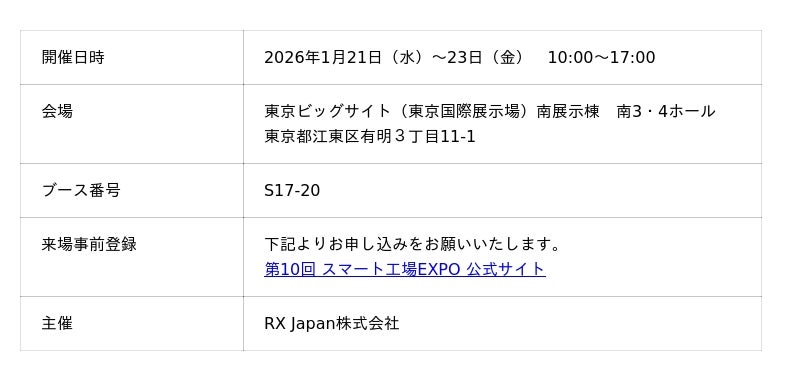 株式会社YE DIGITAL(本社:北九州市小倉北区 代表取締役社長:玉井裕治、以下、YEデジタル)は、2026年1月21日(水)~23日(金)の3日間、東京ビッグサイトで開催される『第10回 スマート工場EXPO』に出展します。