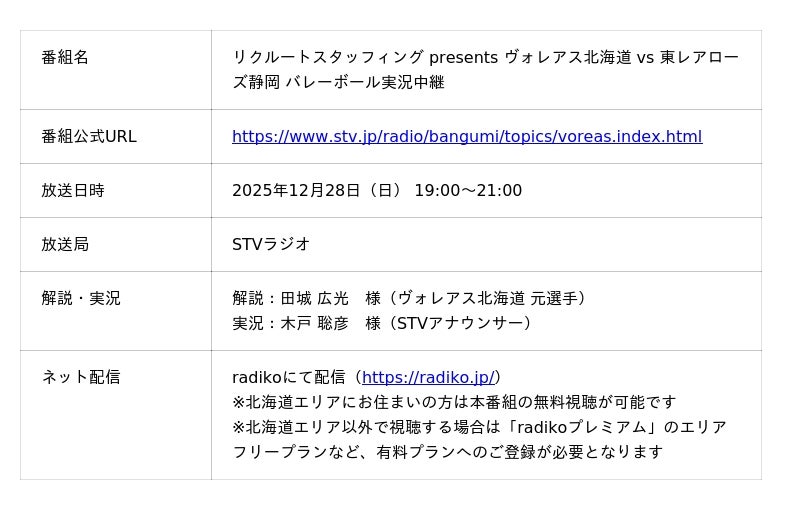 この番組では、2025年12月28日(日)に北海道最大級の収容人数を誇る「北海きたえーる」で開催される、ヴォレアス北海道のホームゲーム『リクルートスタッフィング presents 2025-26 大同生命SV.LEAGUE VOREAS HOKKAIDO 4th HOME GAME 東レアローズ静岡戦』を実況生中継し、試合会場まで直接足を運べない方や試合を観ることに制約がある方、テレビやネット中継がない試合でも観戦を楽しみたいという方など、多様なニーズに応えるものです。ラジオならではの実況と解説で、音声だけで試合の熱気を感じる「耳で楽しむバレーボール観戦」という新たなスポーツ体験を提供します。