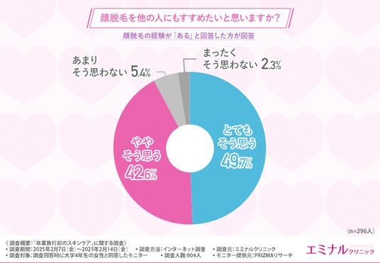 さらに、約4割の方が顔脱毛を経験し、肌のトーンアップや自己処理の手間削減といった効果を実感しており、多くの方が「顔脱毛をおすすめしたい」と考えていることも分かりました。