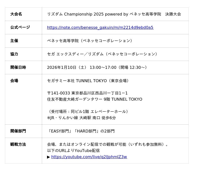 株式会社セガ エックスディー(本社:東京都新宿区、代表取締役 社長執行役員CEO:谷 英高、以下:セガXD)は、株式会社ベネッセコーポレーション(本社:岡山県岡山市、代表取締役会長兼社長:岩瀬大輔、以下:ベネッセ)が運営する通信制サポート校「ベネッセ高等学院」が開催する「勉強×リズム」を楽しむスマホゲーム『Risdom(リズダム)』初の全国大会『リズダム Championship 2025 powered by ベネッセ高等学院』の企画・運営をサポートしたことをお知らせします。