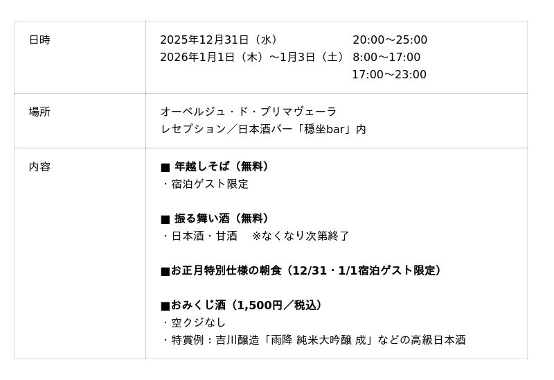 シマダグループ(東京都渋谷区、代表:島田成年)は、軽井沢の「オーベルジュ・ド・プリマヴェーラ」にて、宿泊者限定の年末年始イベントを開催します(一部外来も可)。カウントダウンイベントや年越しそばの提供に加え、お正月仕様の特別朝食、振る舞い酒(日本酒・甘酒)、敷地内「穏坐(おんざ)bar」では吉川醸造の日本酒が当たる“おみくじ酒”など、年末年始を彩る催しをご用意しました。
