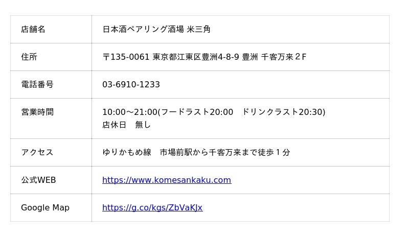 浅草・上野といった新春の活気溢れるエリアからアクセス抜群の豊洲で、市場直送の旬の味覚と日本酒のペアリングを提供いたします。お正月三が日も休まず営業中の米三角で、年始のひとときに、少し足を伸ばして豊洲で味わう“地元価格”の贅沢な食体験をぜひご堪能下さい。今後も東京23区全域へ拡大し、より多くの方に豊洲の魅力を届けてまいります。次はあなたの街が対象になるかも..?