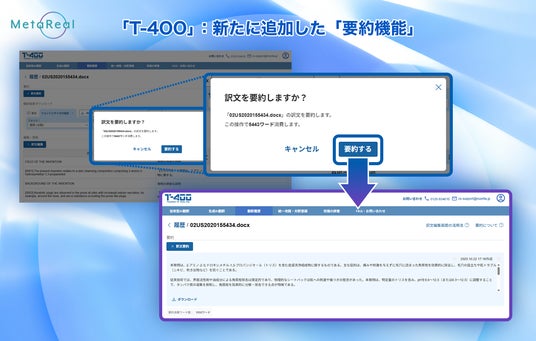 株式会社メタリアルグループで、国内市場No.1※のAI翻訳サービスを開発・提供する株式会社ロゼッタ(代表取締役:五石 順一)は、2025年12月、高精度AI翻訳「T-4OO(ティーフォーオーオー)」において、「翻訳履歴」画面のリニューアルおよび新たに「要約機能」を追加したことをお知らせいたします。