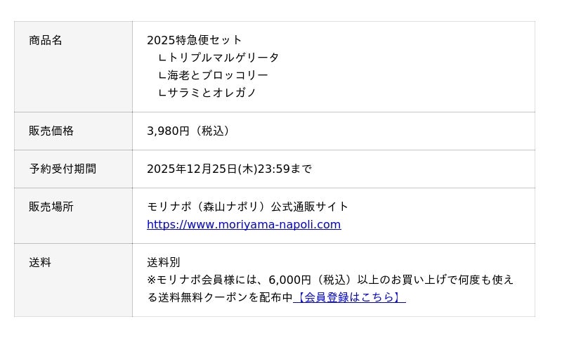 冷凍ピザ等の製造・販売をおこなう株式会社森山ナポリ(本社:石川県金沢市)が手掛けるブランド「モリナポ」では、年内の発送が可能な「2025特急便セット」の緊急販売を開始いたしました。年末の多忙なこの時期、「買い出しに行く時間がない」「デリバリーは混雑して届かない」といったお客様の声を受け、楽しい年末年始をお過ごしいただけるよう、製造枠を拡大し受付いたします。