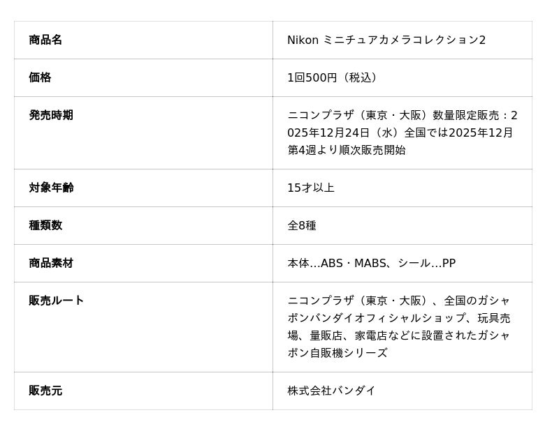 本商品は2025年12月24日(水)より「ニコンプラザ東京」および「ニコンプラザ大阪」にて、数量限定で販売開始します。全国のガシャポンバンダイオフィシャルショップ、玩具売場、量販店、家電店などに設置されたガシャポン自販機シリーズでも、2025年12月第4週より順次販売されます。