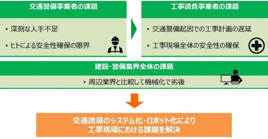 交通誘導警備には下記のような課題があります。通行者、建設従事者の安心・安全を守るためには、システム化・ロボット化による交通誘導警備の高度化・効率化が必須の状況となっています。