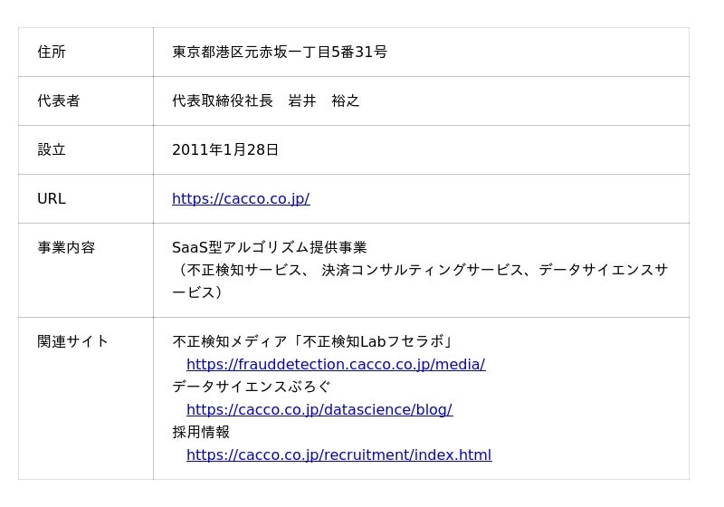Caccoは、「未来のゲームチェンジャーの『まずやってみよう』をカタチに」という経営ビジョンを掲げ、セキュリティ・ペイメント・データサイエンス技術をもとに、アルゴリズム及びソフトウエアを開発・提供し企業の課題解決やチャレンジを支援することを目指しております。 オンライン取引における「不正検知サービス」を中核サービスとして位置づけ、不正ログインから不正注文対策まで対応可能な国内での導入実績数No.1の不正検知サービス「O-PLUX」や金融機関や会員サイトにおける情報漏洩対策の不正アクセス検知サービス「O-MOTION」、フィッシング対策サービス等を提供しております。