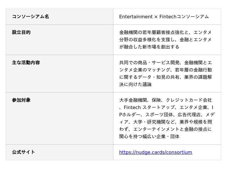ナッジ株式会社(本社:東京都千代田区、代表取締役:沖田 貴史)は、エンターテインメント企業と国内金融機関との連携を促進し、共同での商品・サービス開発などを目指す「Entertainment × Fintechコンソーシアム」を設立することを決定しました。本コンソーシアムは今後、30~50社規模の産業横断エコシステムの構築を目指し、2025年12月25日より参画パートナーの募集を開始します。