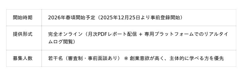 Solo & は、会社に依存しない収入の柱を育てる過程を、結論ではなく途中経過ごと残していくプログラムです。2社目を完全ゼロから再始動し、何を試し、何を捨て、どの数字で進め、どの数字で止めるのか。その判断を、ありのまま記録していきます。思考メモ、数字、スクリーンショットに加えて、生成AIとの対話ログまで月次で共有。迷いも失敗も含めて公開することで、読むたびに次の一手が具体になり、意思決定のセンスが育っていく。可処分所得を増やし、主体的に人生を選べる権利を取り戻すための設計図を、メンバーの皆さんとともに更新し続けます。