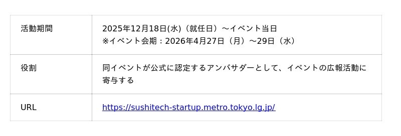 当社は、これまで有識者アドバイザリーやVCとしてスタートアップ支援や東京都のスタートアップ・エコシステム形成に継続的に取り組んできた実績を背景に、SusHi Tech Tokyo 2026の理念を国内外に発信し、スタートアップ、企業、投資家をつなぐ価値創出に貢献すべく、アンバサダーとして参画いたしました。
